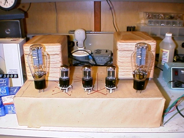 Here is one of the original amplifiers nearing completion, all that is missing are the front panels, which on this particular unit were engraved aluminum with the KTA and SOS logos. Note the use of custom Tamura power transformers along with the Tamura FS-5002 and WE300B output tubes.
