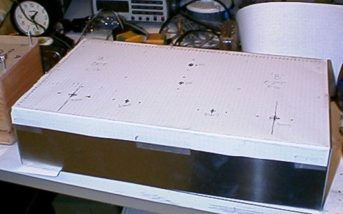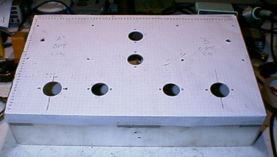 The previous three pictures show the creation of a template for cutting out the holes in the chassis. I used gridded paper as this made it very easy to assure symmetry across the top of the amplifier chassis. The important things here are to make sure that: